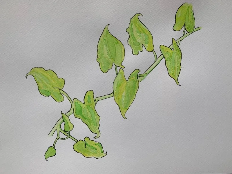 The painting shows a yam vine with eight mature leaves, and a side-shoot with two new leaves. The leaves show a yellow-green mosaic pattern, mostly between the veins or in the narrow green strips bordering the veins.
