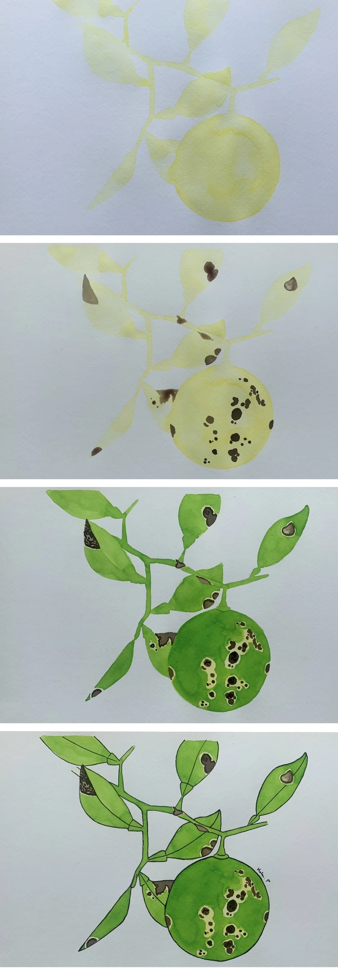 3) I applied a layer of green to represent the leaves, twigs, and fruit, while leaving some areas in pale yellow to show chlorotic regions where necessary.